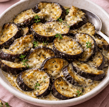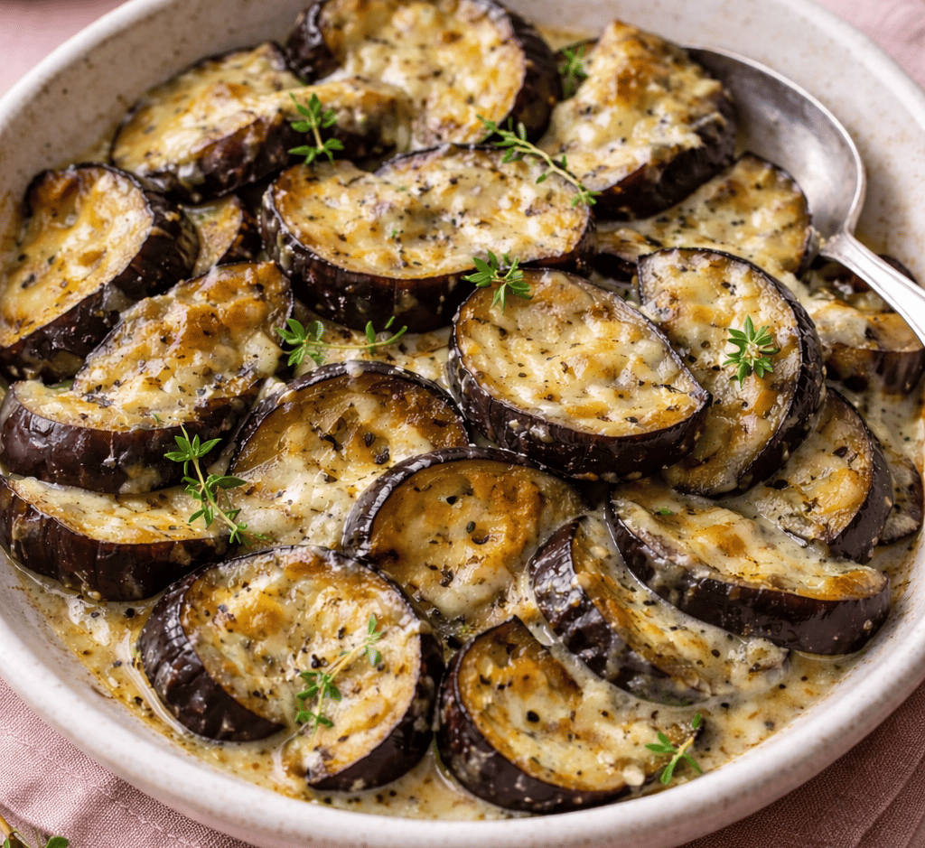 Lorsque les aubergines sont bien fondantes, la crème est versée en filet. Elle se mêle aux sucs et forme une liaison légère. Le fromage est ensuite réparti uniformément. La poêle est à nouveau couverte quelques instants, juste le temps que le fromage fonde et enrobe les aubergines sans tirer ni gratiner.